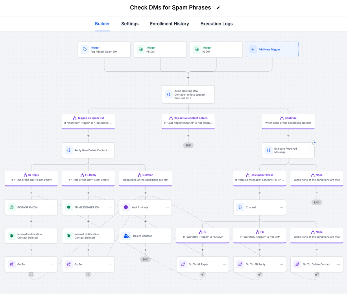 So we built a GHL Workflow to automatically delete the any contact (which also deletes their conversation history) who sends a social DM matching any of 40+ spammy message phrases.